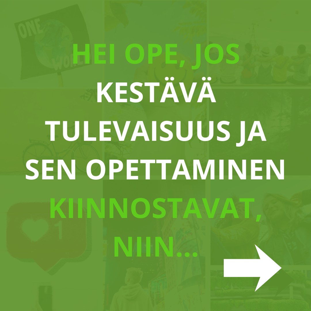 Kestävyyskasvatus saattaa ajoittain tuntua yksinäiseltä puurtamiselta ja tuulimyllyjä vastaan taistelemiselta, mutta tuhannet muut opettajat, kasvattajat sekä muut kestävän kehityksen toimijat pohtivat näitä samoja asioita tahoillaan. Tältä sivulta löydät puolen tunnin mittaisen luennon, jolla käsitellään kestävyyskavatuksen ajankohtaisia haasteita ja ratkaisuja. Lisäksi sivulle on koottu eri oppiaineiden opetukseen sekä ammatilliseen opetukseen soveltuvia materiaaleja ja opettajille suunnattuja koulutuksia, … Lue lisää