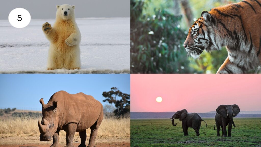 F. Maailmassa on tällä hetkellä noin miljoona uhanalaista lajia. Esimerkiksi norsut, sarvikuonot, jääkarhut ja tiikerit ovat uhanalaisia.