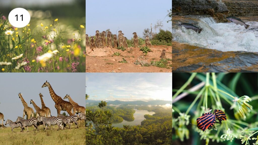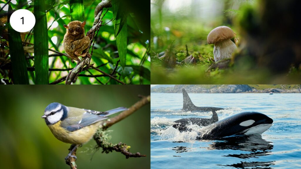 a) Yhdistä kuvat ja kuvatekstit. Tehtävässä on 12 kuvaa tai kuvakokelmaa, jotka liittyvät jollakin tavalla luonnon monimuotoisuuteen ja luontokatoon. Kuviin liittyy lista epäjärjestyksessä olevista kuvateksteistä. Tehtävässä kuvatekstit käydään läpi yksi kerrallaan ja pohditaan, mikä kuvateksti voisi sopia mihin kuvaan. Jokaiselle kuvalle löytyy oma kuvatekstinsä, mutta moni kuvateksteistä voisi sopia useampaan kuvaan.