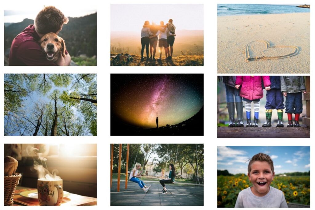 b) Lohtua etsimässä. Alla olevaan kuvakollaasiin on kerätty kuvia ja tunnelmia, jotka voivat auttaa surevaa. Katsokaa kuvia ja keskustelkaa yhdessä seuraavista kysymyksistä: