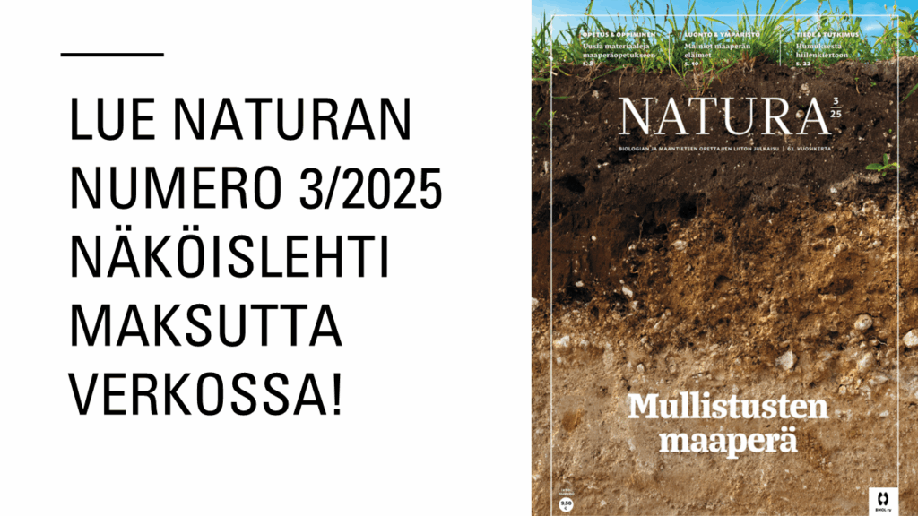 Natura-lehti 3/2025 lehti on osa yhteistyössä Suomen ympäristökeskuksen kanssa julkaistua Arvokas maaperä -hanketta, ja sen artikkeleita on hyödynnetty myös tämän tehtäväpaketin tehtävissä. Osa artikkeleista on julkaistu irrallisina verkkoartikkeleina Naturan verkkolehdessä, jossa julkaistaan makupaloja jokaisesta Naturan numerosta.