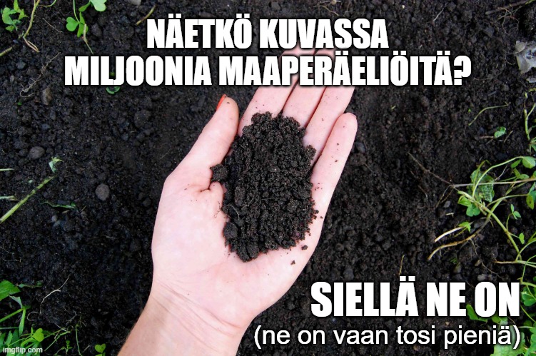 - Maaperän eliöstö muodostaa jopa neljänneksen koko maailman monimuotoisuudesta. Sanotaan, että kourallisessa hyvinvoivaa maata elää jopa miljoonia eliöitä.