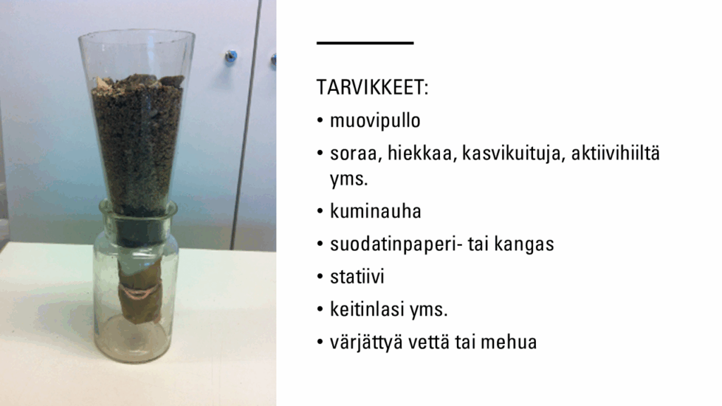 - Rakenna sitten pulloon likaisen raakaveden suodatuskolonni erilaisista materiaaleista (mm. soraa, hiekkaa, kasvikuituja, aktiivihiiltä).