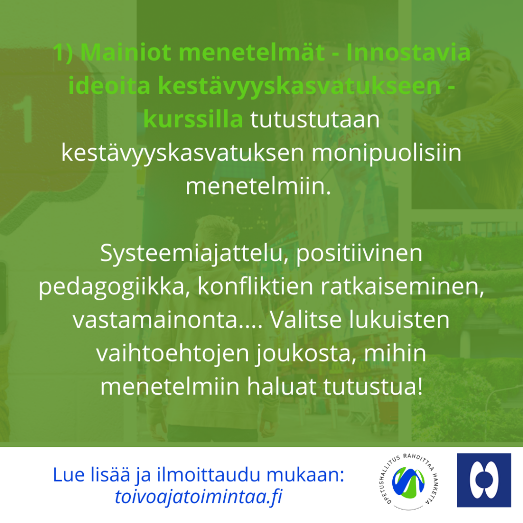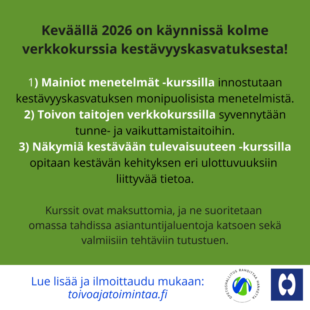 - Mainiot menetelmät – Innostavia ideoita kestävyysopetukseen -verkkokurssin lisätiedot ja ilmoittautuminen täällä.