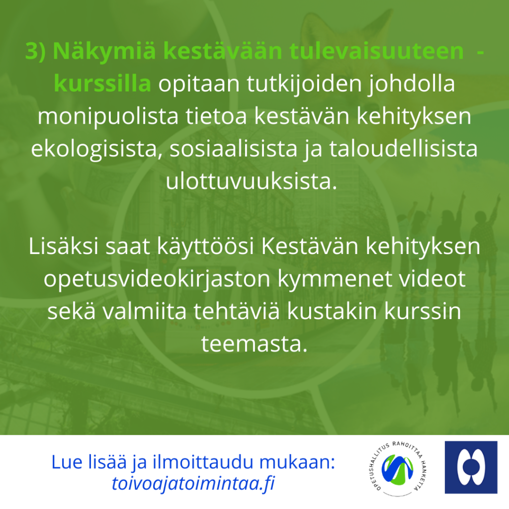- Näkymiä kestävään tulevaisuuteen – verkkokurssin lisätiedot ja ilmoittautuminen täällä.